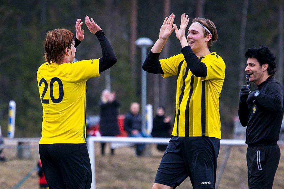 Jägersborgs IFs Kevin Simu har gjort 2-0 under träningsmatchen mellan Jägersborgs IF och Hallaryds IF. Bild: Peter Reimer / Hemmamatch.com